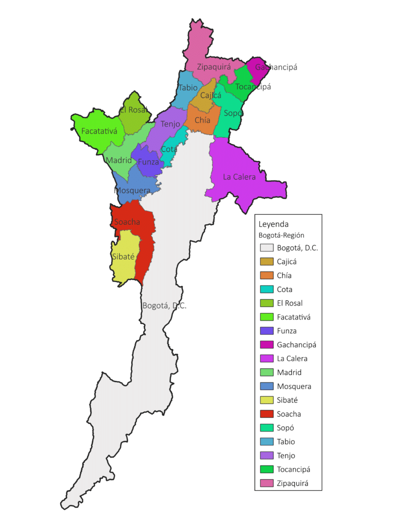 Bogotá-Región comprende además del Distrito Capital, los municipios de Cajicá, Chía, Cota, El Rosal, Facatativá, Funza, Gachancipá, La Calera, Madrid, Mosquera, Sibaté, Soacha, Sopó, Tabio, Tenjo, Tocancipá y Zipaquirá.